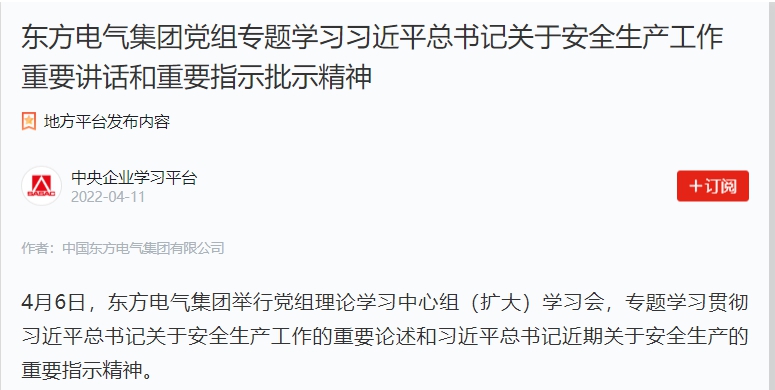 4月6日,東方電氣集團(tuán)舉行黨組理論學(xué)習(xí)中心組(擴(kuò)大)學(xué)習(xí)會(huì),專題學(xué)習(xí)貫徹習(xí)近平總書(shū)記關(guān)于安全生產(chǎn)工作的重要論述和習(xí)近平總書(shū)記近期關(guān)于安全生產(chǎn)的重要指示精神。