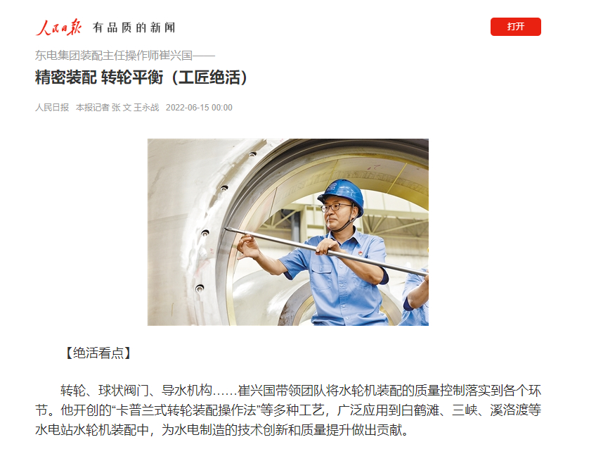 追求產(chǎn)品品質(zhì)與效率,崔興國還開創(chuàng)了“卡普蘭式轉(zhuǎn)輪裝配操作法”等多種工藝,廣泛應(yīng)用到白鶴灘、三峽、溪洛渡等特大型水電站水輪機(jī)裝配中,為水電制造的技術(shù)創(chuàng)新和質(zhì)量提升做出貢獻(xiàn)。“只有通過技能水平的提高制造出更高質(zhì)量的產(chǎn)品,才能為社會(huì)創(chuàng)造價(jià)值?!痹诖夼d國看來,從事制造業(yè)就意味著要不斷提升技能水平,追求更高的標(biāo)準(zhǔn)。