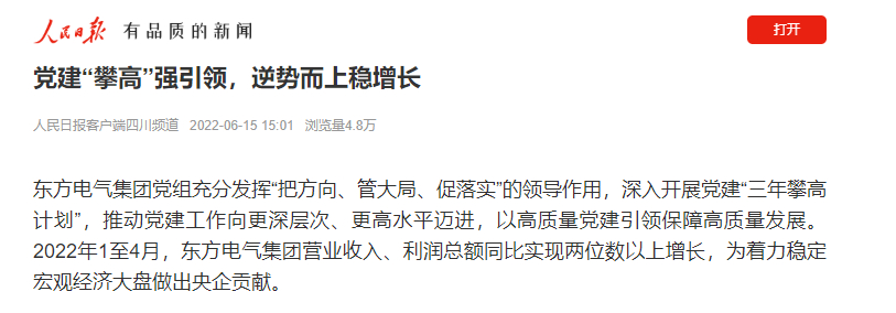 東方電氣集團黨組充分發(fā)揮“把方向、管大局、促落實”的領(lǐng)導(dǎo)作用,深入開展黨建“三年攀高計劃”,推動黨建工作向更深層次、更高水平邁進,以高質(zhì)量黨建引領(lǐng)保障高質(zhì)量發(fā)展。2022年1至4月,東方電氣集團營業(yè)收入、利潤總額同比實現(xiàn)兩位數(shù)以上增長,為著力穩(wěn)定宏觀經(jīng)濟大盤做出央企貢獻。