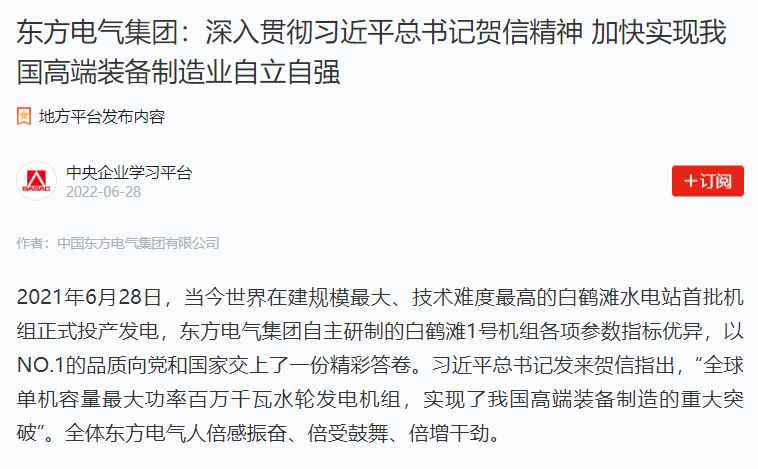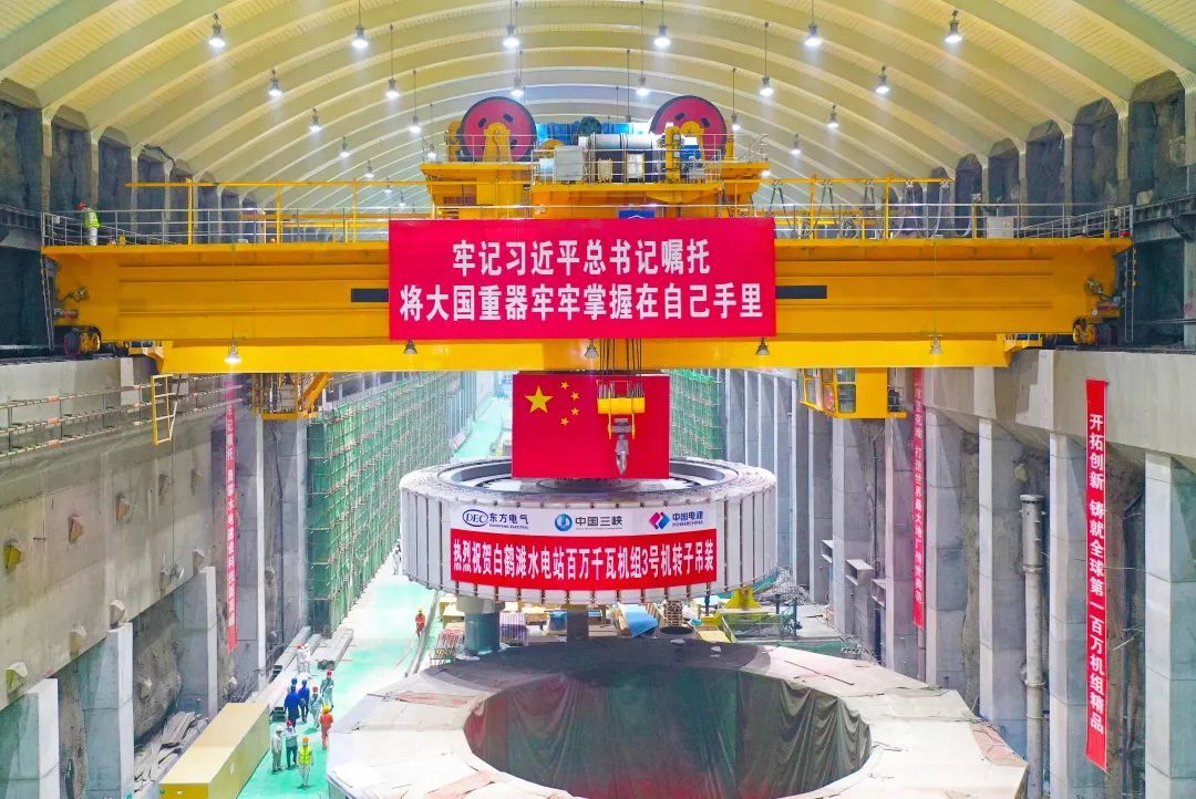 2021年6月28日,當今世界在建規(guī)模最大、技術難度最高的白鶴灘水電站首批機組正式投產發(fā)電,東方電氣集團自主研制的白鶴灘1號機組各項參數(shù)指標優(yōu)異,以NO.1的品質向黨和國家交上了一份精彩答卷。習近平總書記發(fā)來賀信指出,“全球單機容量最大功率百萬千瓦水輪發(fā)電機組,實現(xiàn)了我國高端裝備制造的重大突破”。全體東方電氣人倍感振奮、倍受鼓舞、倍增干勁。