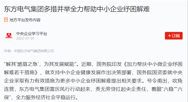 “解其‘燃眉之急’,為其發(fā)展賦能”。近期,國(guó)務(wù)院印發(fā)《加力幫扶中小微企業(yè)紓困解難若干措施》,就支持中小企業(yè)健康發(fā)展作出決策部署,國(guó)務(wù)院國(guó)資委就中央企業(yè)采取有力有效措施為更多中小企業(yè)紓困解難提出相關(guān)要求。號(hào)令甫出,吹角連營(yíng),東方電氣集團(tuán)雷厲風(fēng)行行動(dòng)起來(lái),責(zé)無(wú)旁貸扛起央企責(zé)任,著眼“六穩(wěn)”“六?!保Ψ?wù)經(jīng)濟(jì)社會(huì)平穩(wěn)運(yùn)行。