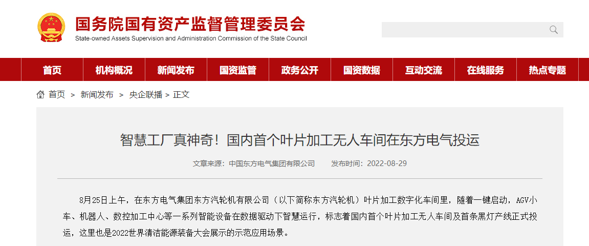 8月25日上午,在東方電氣集團東方汽輪機有限公司(以下簡稱東方汽輪機)葉片加工數(shù)字化車間里,隨著一鍵啟動,AGV小車、機器人、數(shù)控加工中心等一系列智能設(shè)備在數(shù)據(jù)驅(qū)動下智慧運行,標志著國內(nèi)首個葉片加工無人車間及首條黑燈產(chǎn)線正式投運,這里也是2022世界清潔能源裝備大會展示的示范應(yīng)用場景。