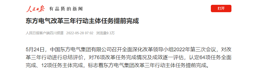 5月24日,中國東方電氣集團有限公司召開全面深化改革領(lǐng)導(dǎo)小組2022年第三次會議,對改革三年行動進行總結(jié)評價,對76項改革任務(wù)完成情況及成效逐一評估,認定64項任務(wù)全面完成、12項任務(wù)主體完成,標志著東方電氣集團改革三年行動主體任務(wù)提前完成。