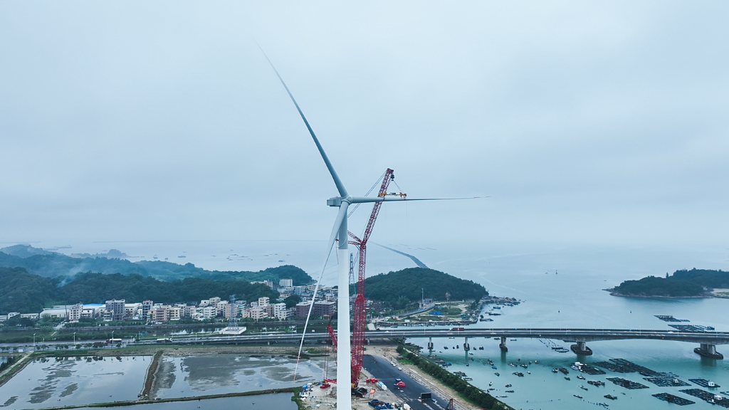 6月5日,18兆瓦半直驅大功率海上風(fēng)電機組在廣東省汕頭市風(fēng)電臨海試驗基地成功完成吊裝。(東方電氣集團供圖)