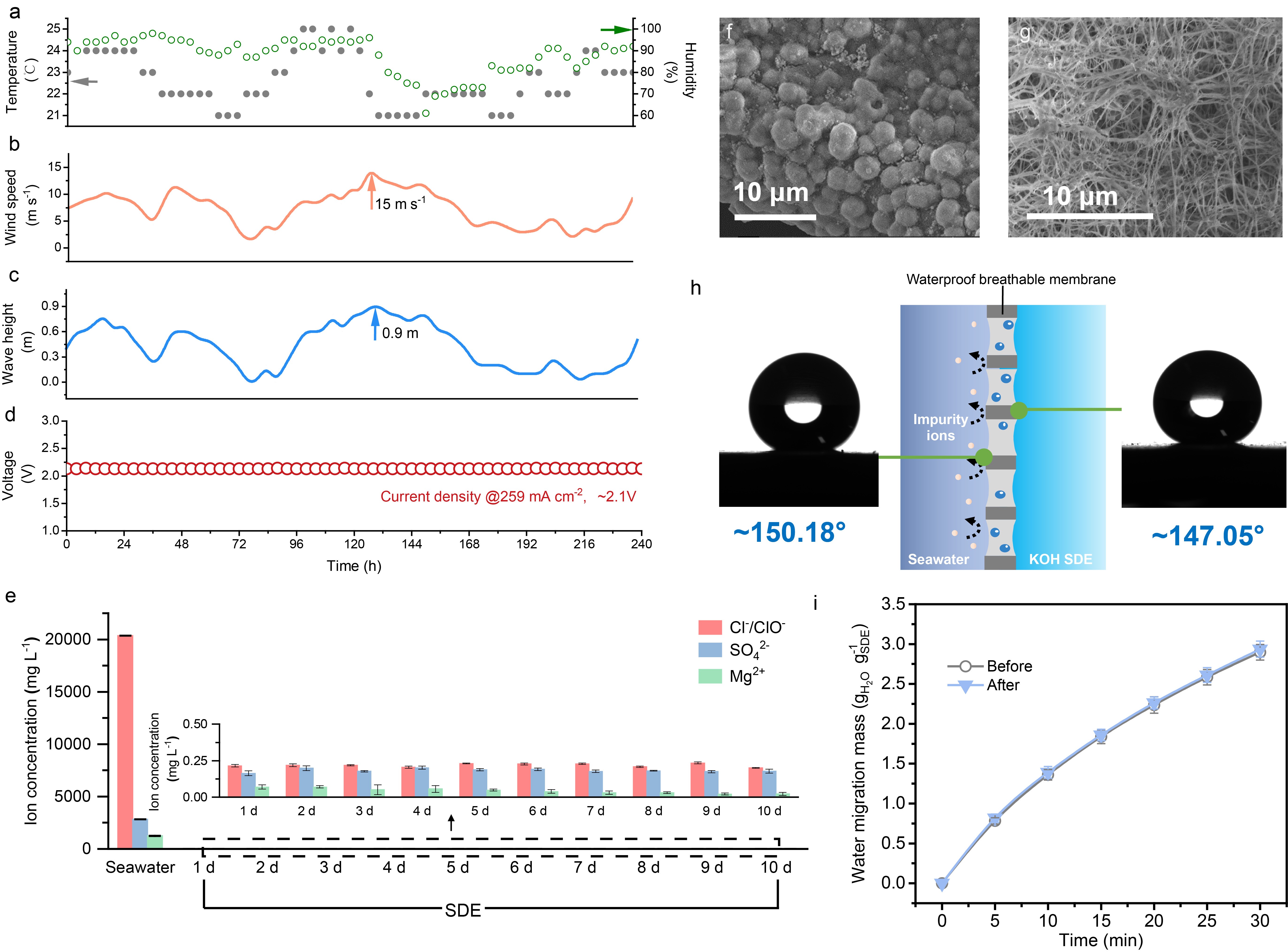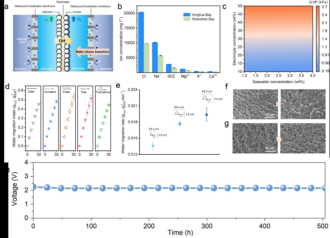 該團隊基于2022年11月在《自然》發(fā)表的“海水直接電解制氫全新原理”,構建出真實(shí)大海不可控海洋波動(dòng)環(huán)境下海水直接制氫全新路徑與技術(shù),并系統研究不同海水組分(廣東省深圳灣、福建省興化灣)濃度變化所導致界面蒸氣壓差差異,闡明濃度動(dòng)態(tài)變化下相變遷移過(guò)程的自調控自適應機制。