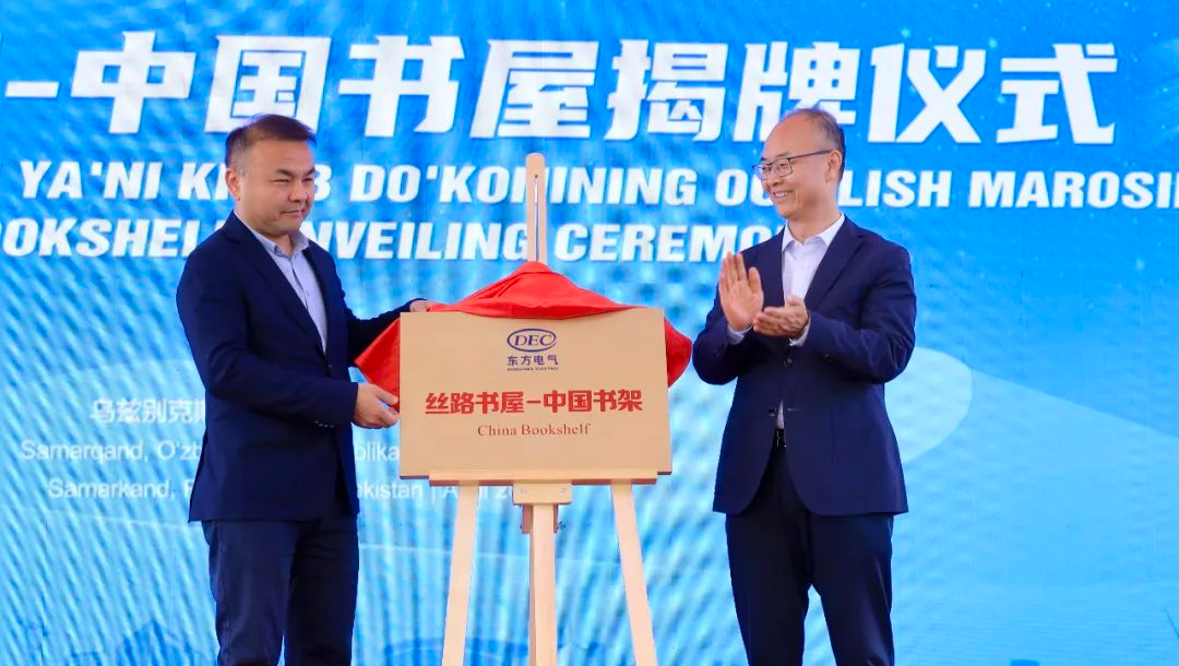 活動(dòng)中,烏米德·馬馬達(dá)米諾夫和袁明剛共同為東方電氣“絲路書(shū)屋——中國(guó)書(shū)架”揭牌。此次,東方電氣共捐贈(zèng)150余冊(cè)圖書(shū)內(nèi)容涵蓋中國(guó)經(jīng)濟(jì)社會(huì)發(fā)展、歷史文化、文學(xué)藝術(shù)、科技發(fā)展等方面,為當(dāng)?shù)貑T工深入了解中國(guó)搭建窗口,進(jìn)一步構(gòu)筑兩國(guó)文化交流之橋。