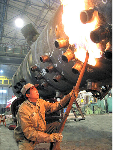 2005年,鐘家權光榮退休了,但是,摯愛(ài)東鍋的鐘家權,在公司、車(chē)間領(lǐng)導和職工的關(guān)心支持下,又拿起了焊槍?zhuān)c昔日的伙伴們一起奮戰在核電工段,參與了廣東嶺澳核電站二期1000MW核島主設備制造。經(jīng)過(guò)1年時(shí)間的艱苦奮斗,2006年8月份,順利完成3臺安注箱的焊接任務(wù);2006年10月初,要求高、工作條件最為艱苦的1臺硼注射器焊接難關(guān)又被攻克了,為東方鍋爐按期履行合同做出了新的貢獻。在安注箱啟運前的那一刻,鐘家權讓記者拍照留下了這一令他一輩子自豪而又難忘的瞬間……