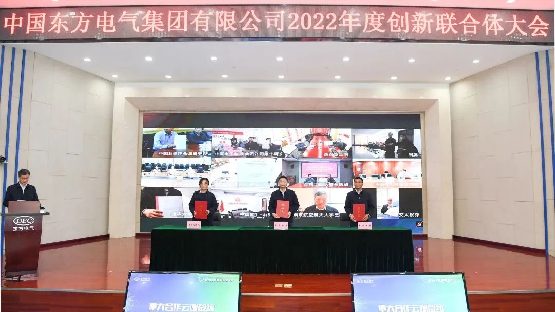 集團公司科技信息部負責人匯報了2022年度創(chuàng)新聯(lián)合體工作情況。東方電氣集團與12家單位簽署了合作協(xié)議。