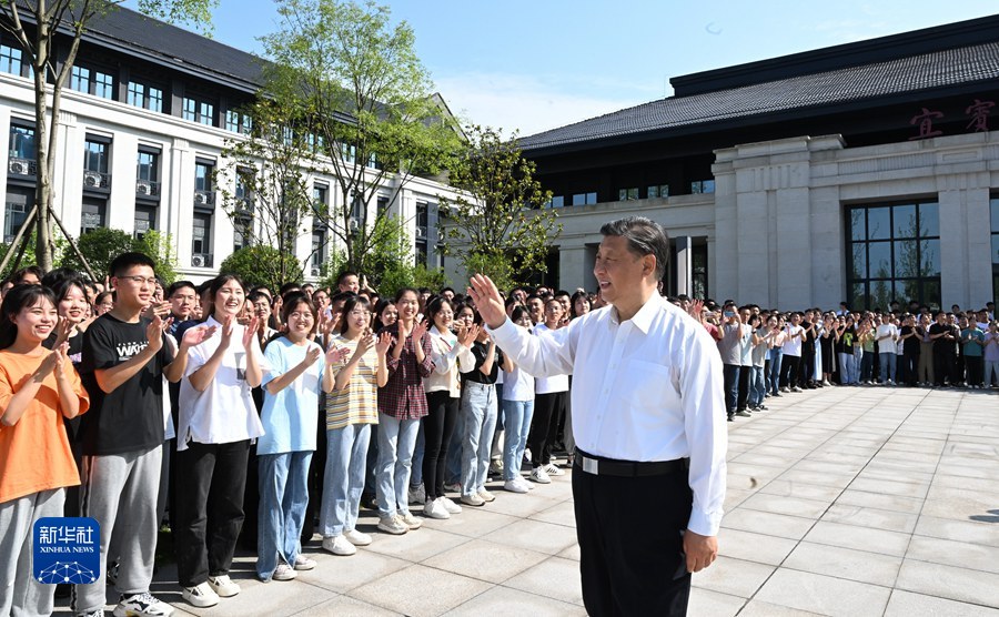 6月8日,中共中央總書(shū)記、國家主席、中央軍委主席習近平在四川考察。這是8日下午,習近平在宜賓學(xué)院考察時(shí),向師生們揮手致意。新華社記者 李學(xué)仁 攝
