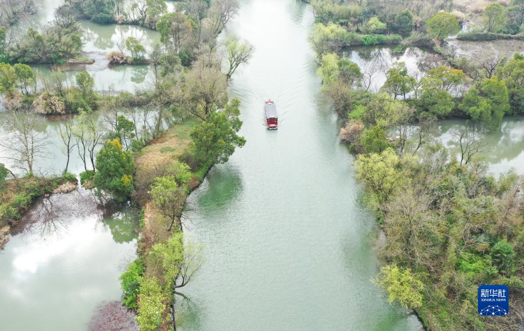 游船行駛在西溪濕地水道上(2021年3月2日攝,無(wú)人機照片)。新華社記者 翁忻旸 攝