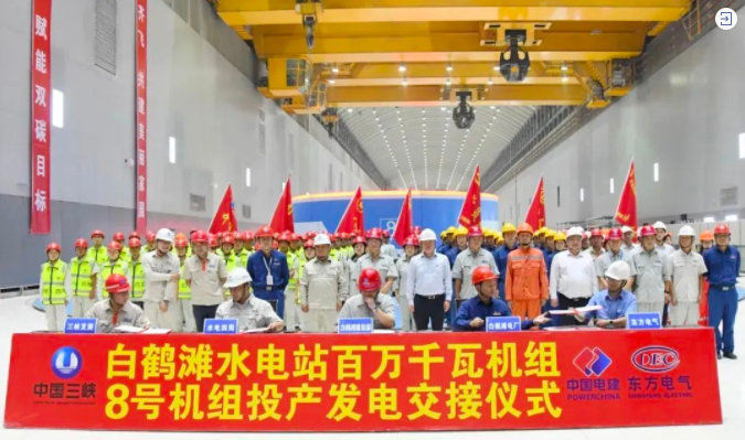 2022年9月22日,隨著(zhù)8號機組完成72小時(shí)試運行,金沙江白鶴灘水電站左岸全部8臺機組投產(chǎn)。至此,東方電氣白鶴灘項目研發(fā)制造、安裝服務(wù)任務(wù)圓滿(mǎn)收官。
