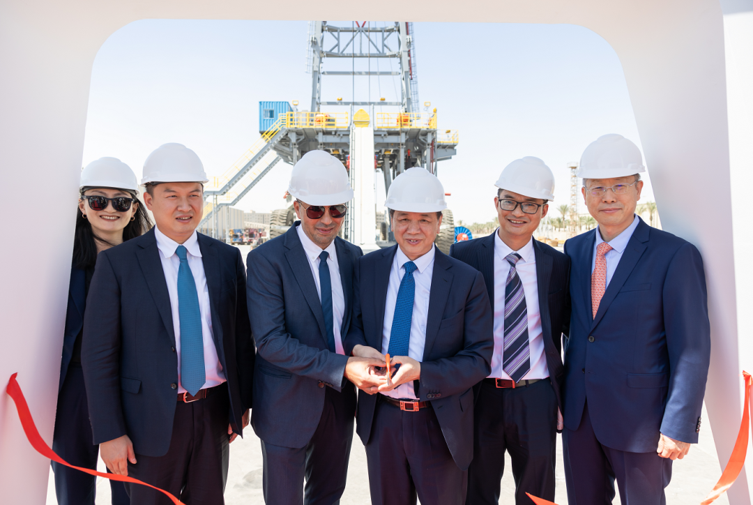 儀式上,參會領(lǐng)導共同為第一套總裝下線的鉆機剪彩,參觀了宏華埃及生產(chǎn)工廠和制造中的鉆機,并慰問了在埃中方員工。