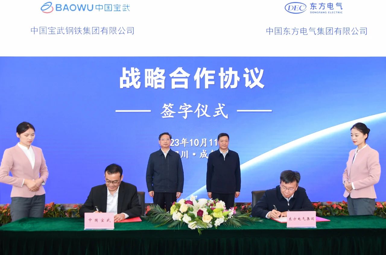 本網(wǎng)訊 10月11日,中國東方電氣集團有限公司與中國寶武鋼鐵集團有限公司在蓉簽署戰(zhàn)略合作協(xié)議。在東方電氣集團黨組書記、董事長俞培根,中國寶武黨委書記、董事長胡望明的共同見證下,東方電氣集團黨組成員、副總經(jīng)理李忠軍,中國寶武黨委常委、寶鋼股份黨委書記、董事長鄒繼新代表雙方簽字。